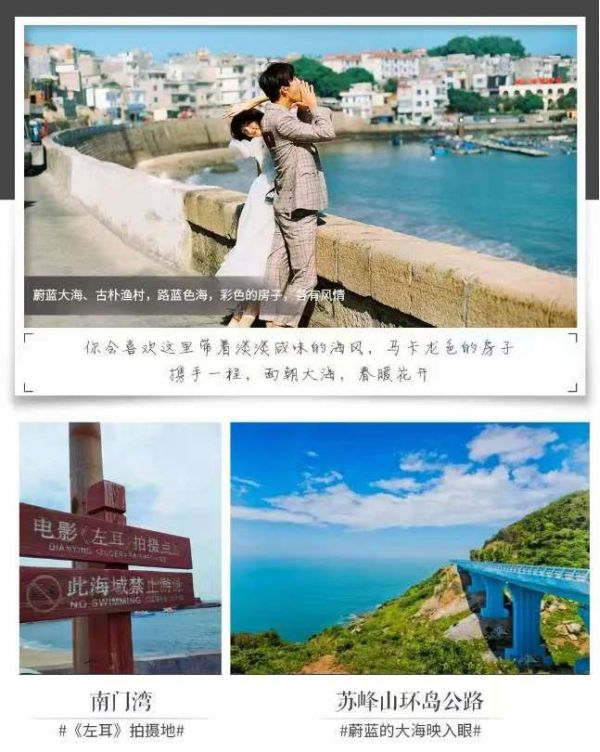 早餐后乘车前往东山岛;抵达后前往【南门湾】海湾辽阔、沙滩平缓、绿树成荫,极具南国滨海风光特色。这里静泊在海 上的渔船,与海钓的人们相映成趣,蔚蓝的蓝天和大海交汇在远方,优美的景色吸引了电影《左耳》、综艺 《我们来了》来此拍摄取景。