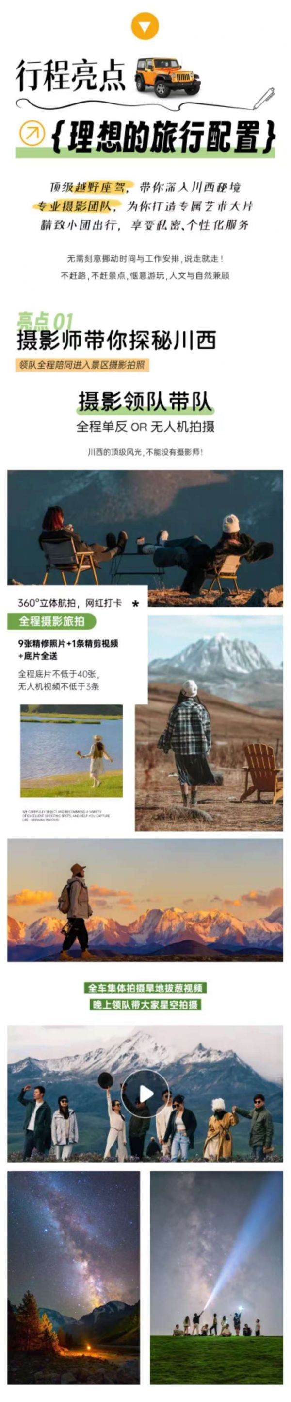 无人机+单反旅拍(底片全送+9张精修照片+1条精剪视频),底片全程不低于40张,无人机视频不低于3条(全车人拍摄旱地拔葱视频,晚上领队带大家星空拍摄);赠送藏服旅拍(6张底片+3张精修),全场衣服通选(除了三款羊皮袄)+精妆+精造;随车便携式氧气瓶每人2瓶、旅行三宝1套/人、撒隆达1份;随车配备矿泉水、急救包、指尖血氧仪;赠送特色土火锅+篝火晚会+藏族歌舞表演晚会;可免费提供露营桌椅板凳炉具,可以野餐(食材车上游客一起AA),需提前预约;体验藏区文化特色-画唐卡;