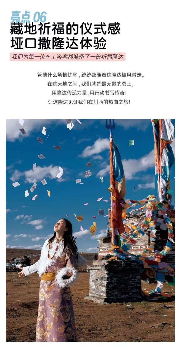 无人机+单反旅拍(底片全送+9张精修照片+1条精剪视频),底片全程不低于40张,无人机视频不低于3条(全车人拍摄旱地拔葱视频,晚上领队带大家星空拍摄);免费提供露营桌椅板凳炉具,可以野餐(食材车上游客一起AA),物资有限需提前预约;赠送藏服旅拍(6张底片+3张精修),全场衣服通选(除了三款羊皮袄)+精妆+精造;随车便携式氧气瓶每人2瓶、旅行三宝1套/人、撒隆达1份;随车配备矿泉水、急救包、指尖血氧仪;赠送特色土火锅+篝火晚会+藏族歌舞表演晚会;