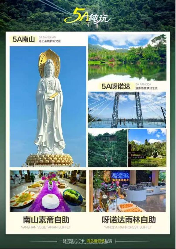 *用餐:含2正4早(不用不退费) ,早餐:自助早餐 ,特色餐:南山素斋自助、呀诺达雨林自助。