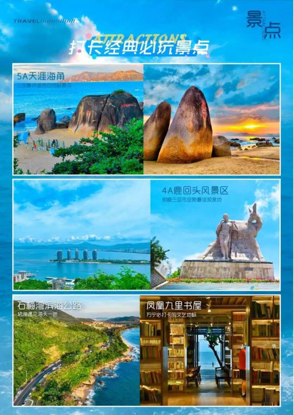 【大小洞天】国家5A级景区(时间不少于120分钟):至今已有800多年历史。大小洞天融汇了秀丽的海景、山景和石景,既可以看到“小洞天”、“海山奇观”、“仙人足”等摩崖石刻,还能参观号称植物中的“活化石”南山不老松。【天涯海角】国家5A级景区(游览时间不少于120分钟):情侣们神往的圣地,不仅有南天一柱,日月神石,丰富的打卡点能戳中你所有的浪漫神经,小红书火出圈的天涯书局、火车、情侣树,还有婚拍基地的教堂、热气球、粉色城堡都超级出片。