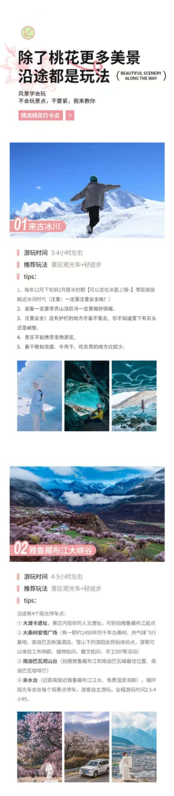 早餐后前往林芝桃花主会场【嘎拉桃花村】,被誉为“林芝桃花第一村”,是巴宜区乃至整个林芝地区的最佳赏花地,一排排盛开的桃花在绿色麦田梯田的衬托下,整个山坡如同藏族妇女的围裙耀眼夺目,素有“西藏江南”的美誉。这里的千年桃树不是人为却巧夺天工,为您呈现只属于西藏的美。之后驱车翻越【色季拉山】垭口,抵达【鲁朗小镇】,鲁朗小镇有被称为“叫人不想家的地方”,推荐可以在此品尝当地特色餐—鲁朗石锅鸡,午餐后,经过318国道上著名的通麦天险,不过现在的【通麦大桥】已经贯通,天堑变通途,。傍晚抵达【波密桃花沟】,十里桃花沟,可谓穿越进入了桃源秘境。晚上在波密县城入住。
