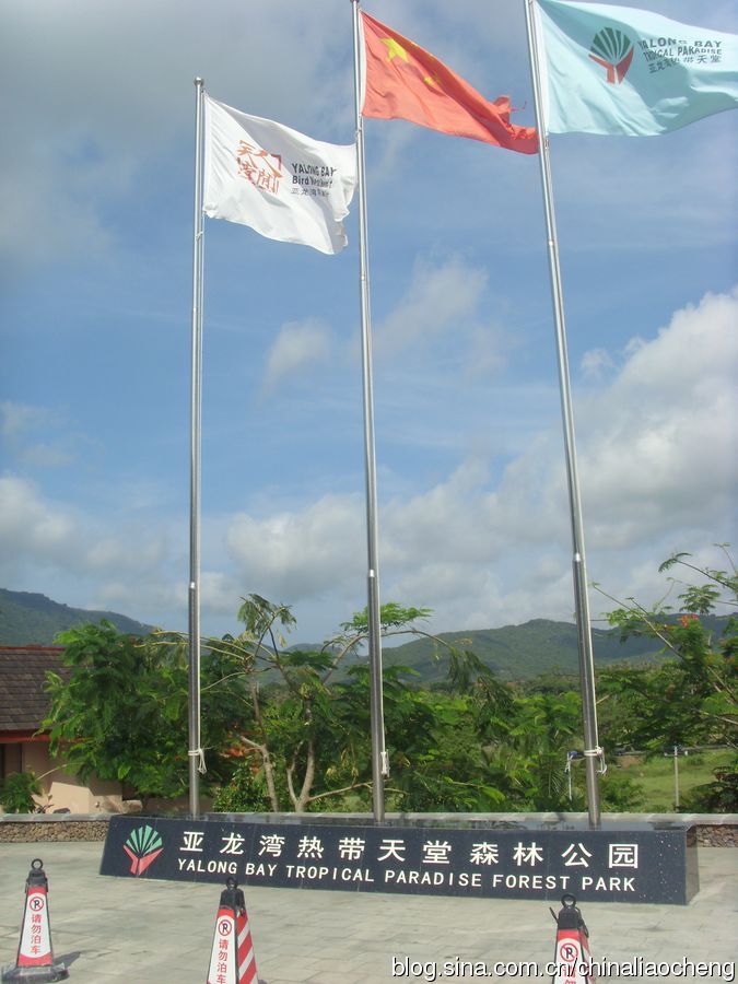 经过一番跋涉,终于到达了亚龙湾热带天堂森林公园。看,五星红旗随风飘扬显得多么夺目啊。