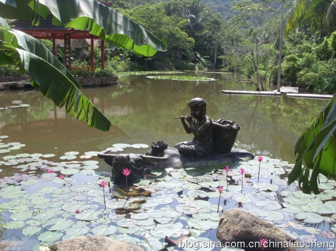 葱翠的热带树木栽种在各处,高高的直插云霄。水中荷叶漂浮,荷花朵朵,好美的一幅水彩画啊!
