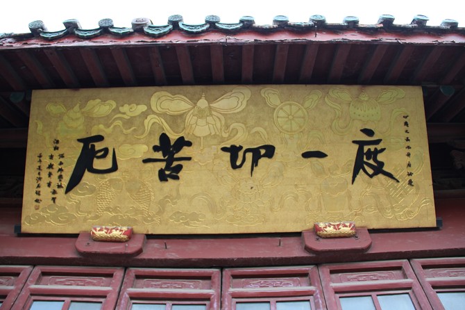 大雄宝殿重檐斗拱,雕梁画拣,金碧交辉,其内供奉有释迦摩尼、阿弥陀佛和药师佛三世佛,均高一丈三尺,其后是大型雕塑海岛观音,取材于《华严经》善财童子53参的故事,形象地表现出南海观音普渡众生的场面,东西两壁供奉的是十八罗汉。