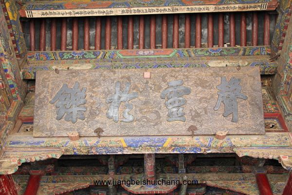 仰面观之,有一块大匾高高悬在大门上,上书“声灵于铄”四个大字,寓意关公美好的声名象美好的音乐一样传扬四方。这块匾是清乾隆十五年乾隆帝所题,同时两侧并题有联曰:“翊汉表神功龙门并峻,扶纲伸浩气伊水同流。”由此可以看出,不仅百姓敬仰关公,古代帝王对关公也同样尊崇。