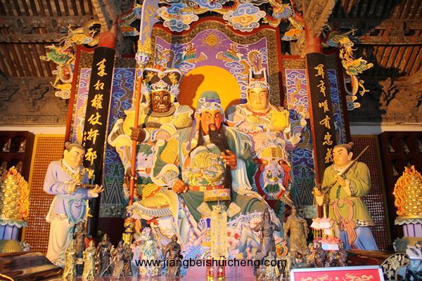 走进大殿,关羽金身端坐眼前,它头戴十二冕旒帝王冠,身穿锦缎绣龙袍,手持一把标明身份的“七星”护板,庄严肃穆。该塑像是1986年仿塑的,原来的塑像在文革中被毁掉了。原像是金身帝王像,是在康熙四年加封关公为帝后以帝制塑造的。