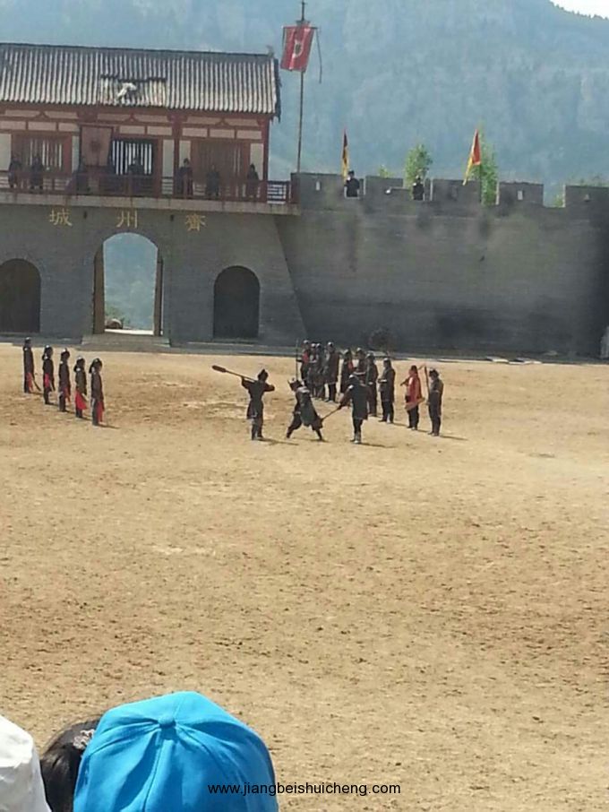 九顶塔影视剧场精心打造了五大实景剧。有红色经典参与剧《地道战》、好莱坞场景剧《山洪暴发》、大型马战实景剧《好汉秦琼》、《武松醉打蒋门神》、《刘三姐招亲》,是国内实景剧节目演出最多的景区。红色经典参与剧《地道战》演员阵容庞大,具有较强的思想性、参与性、喜剧性和娱乐性,再现了当年地道战的战争场景,浓缩了地道战的精彩片段,是一部难得的“牢记历史、勿忘国耻”的生动爱国主义教育题材。好莱坞场景剧《山洪暴发》,再现了暴风骤雨、惊心动魄的场面,气势磅礴,令人震撼,弘扬了中国人民不被自然灾害所吓倒和团结一致、克服困难、重建家园的大无畏精神。