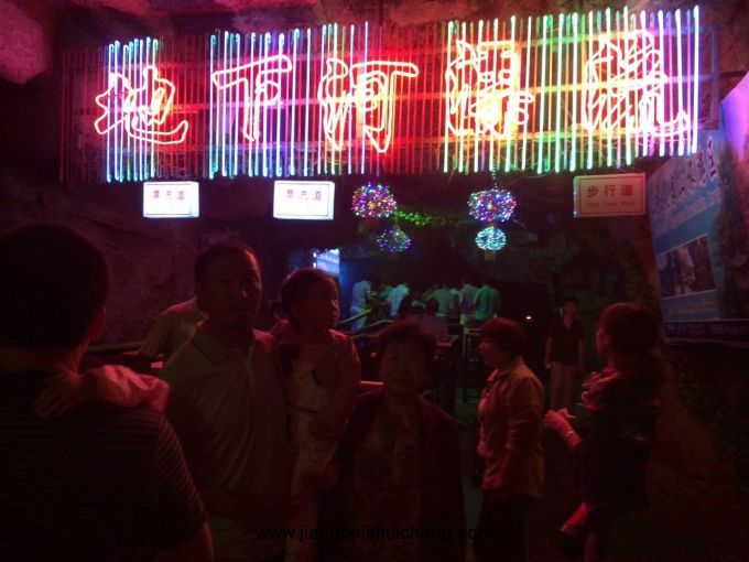 第二天游览地下大峡谷,地下大峡谷最出名的游玩项目当属地下漂流。地下河漂流项目经过改造,漂流长度由原来的723米延长到1000米。该项目已经得到上海大世界吉尼斯记录总部的认证,被誉为中国最长的溶洞漂流项目[。漂流道的改造设计充分体现了溶洞内的幽深莫测,起伏高下,波激浪涌,抑扬顿挫的特点和恐龙模型的阵阵吼声,将地下河漂流的原生野始,惊险刺激演绎的淋漓尽致。
