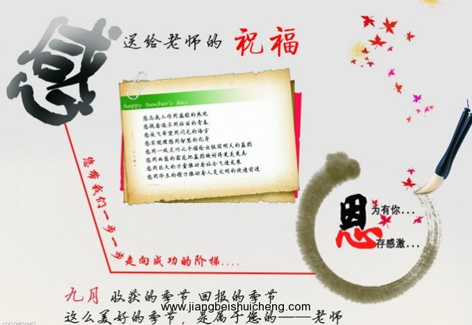 中国有悠久的尊师重道的传统,古代就有“人有三尊,君、父、师”的说法。《吕氏春秋•尊师》云:“生则谨养,死则敬祭,此尊师之道也。”《师说》中:“师者,所以传道授业解惑也。”在中国几千年的灿烂历史中,“师”,总是受人尊敬,被人爱戴的。老师,是人类文化得以传承的功臣,他们做的贡献是极其巨大的。