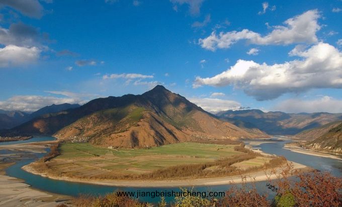 金沙江第一湾位于川滇藏三省区结合部的得荣县子庚乡境内。由北向南纵贯全境的定曲河,在先后接纳了玛伊河和硕曲河之后,携三江之水投入了金沙江的怀抱,在江水汇合处,形成“三壁夹两江”的奇景。穿山越谷而来的金沙江,由此水势更加浩荡,峡谷逐渐开阔,在即将冲出这川滇要塞之时,它似乎想先舒缓一下长途奔波的疲劳,于是放慢脚步,围绕着金字塔般的日锥峰潇洒地画了一个“Ω”字形的大拐弯。孰料这不经意的即兴之作,竟成就了一处奇观。