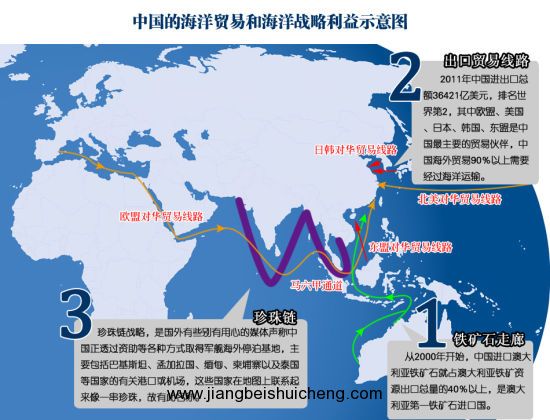 三是打通中国通往印度洋的陆上战略通道。中国应力求控制进出印度洋的各个咽喉要地。中国海军谋求控制从苏伊士运河到霉尔木兹海峡再 到马六甲海峡等印度洋水域咽喉要道的能力。中国不是濒临印度洋的国家,只能绕道南中国海通过马六甲海峡进入印度洋,或者借助周边国家建立陆上通道抵达印度洋。目前,中国与印度洋之间的主要通道仍是南中国海-马六甲海峡,中国进口原油的80%和商品贸易的70%都是通过这条路线。但这条海上通道不仅路途遥远,而且风险巨大,中间有台湾海峡,以及菲律宾、越南、澳大利亚、新加坡的美国军事基地。