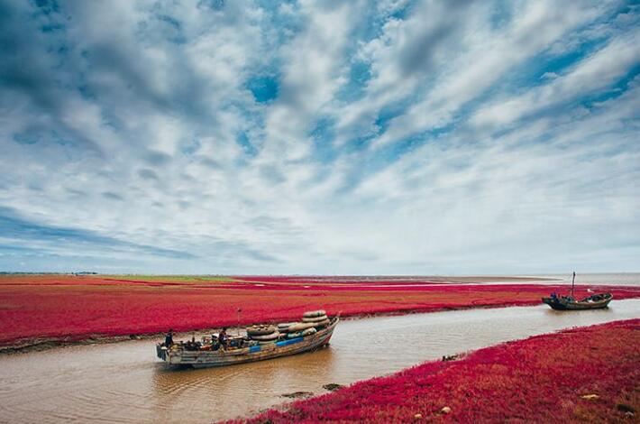 游览后午餐,乘车前往我国北方最大的滨海湿地城市—盘锦市,抵达盘锦后前往游览【盘锦红海滩廊道】(游览约3小时),红海滩地处辽河三角洲湿地,位于盘锦市西南海滨,是由大片红色的碱蓬草形成的著名湿地,红海滩国家风景廊道是红海滩面积最大的景区,在这里你可以漫步于木栈道、看红如炽焰的碱蓬草在海岸线上无限延伸,而红海滩远处的油井在夕阳下更是一副迷人的画卷,秋天来此还能看到金黄色的稻田与红海滩相呼应,以及成群的候鸟展翅于滩涂的深处,游览后晚餐,晚餐品尝盘锦稻香河蟹宴,晚餐后入住酒店休息。