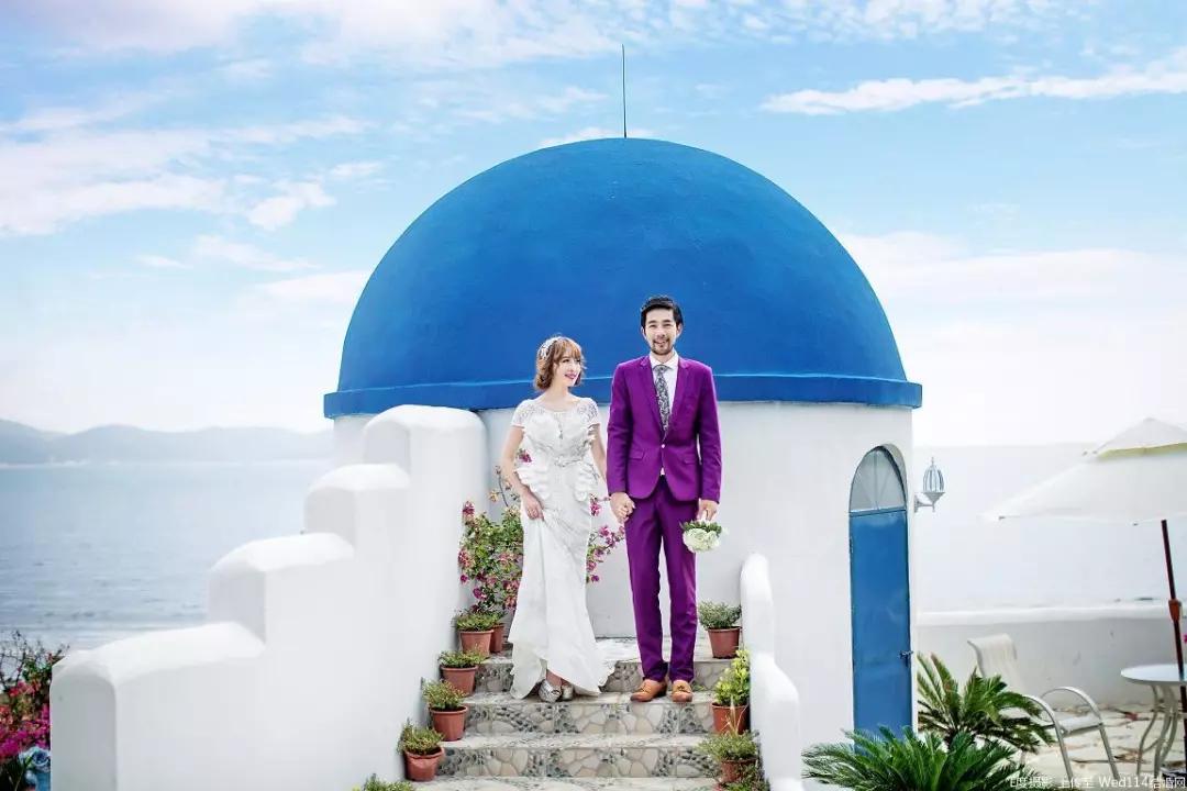洁白的墙壁,蔚蓝的屋顶,宛若在希腊的圣托里尼岛上,海边的水晶教堂,将天空、大海和山石收入其中。