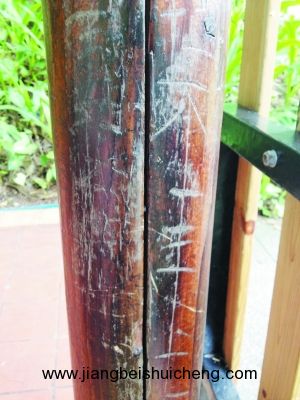 走进光孝寺和六榕寺,白墙绿瓦格外宁静。但寺内的千年古树却遭殃了,在光孝寺观音台旁边的竹群中,几乎找不到一棵干净的竹子。每一颗竹子上都刻有名字、×××与×××相爱到永远、平安等字眼。而在光孝寺放生堂附近的一棵千年菩提树上,也有不少伤痕。六榕寺的清水砖墙平均不到一平方米的地方就有约两三处涂鸦,由于寺庙有定期清理,因此记者看到一块块白色的痕迹。光孝寺寺内的工作人员告诉记者:“佛寺比较森严,游客不敢随便在建筑上刻画,但在树木上刻画就多了,我见到的大多都是年轻男女所为。”