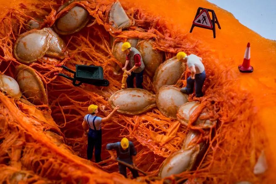 来自匈牙利布达佩斯的美食摄影师彼得近三年改变了以往的摄影风格,他利用微缩模型、食物和日常用品搭配组合,创造了一个名为“Tiny Wasteland”(袖珍荒原)的摄影系列。