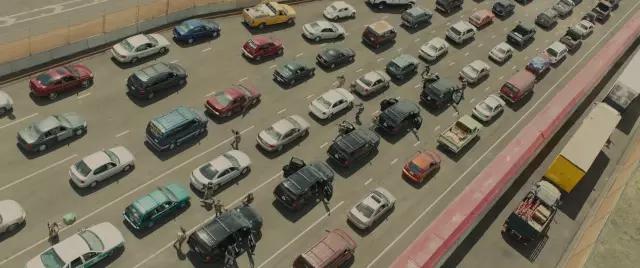 AC:电影前20分钟是一段非常有冲击力的片段,Emily Blunt饰演的角色和她的队伍开进华雷斯(边境城市)。这个片段里混合航拍镜头和在车上的镜头,展现他们越过边境