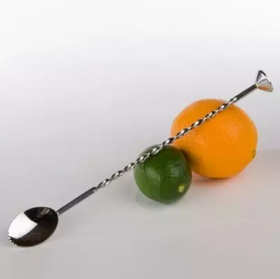 长匙的两端功能是不一样的,一端是叉状,一般用来叉取樱桃柠檬等;另一端为匙,用来搅拌混合鸡尾酒原料,而匙的容量一般为一茶匙。这种是比较简单的工具,一般家中可以汤匙代替即可。