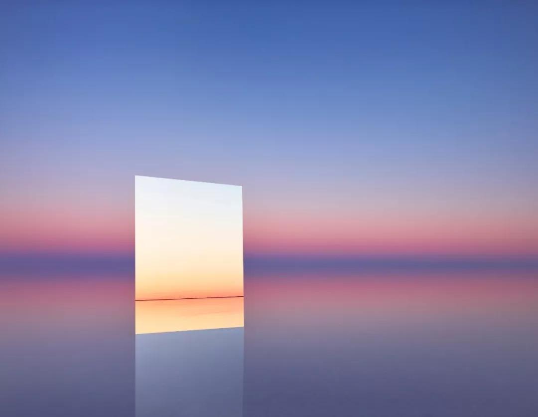 镜子斜斜地立在湖面,因此能同时捕捉到湖面和天空的景色,周围环境颇为荒凉,好像是自然环境正在虚荣的“顾镜自怜”。湖水中的镜子也将空间割裂的同时统一到了一个画面里,在这极简的画面中,镜子仿佛通往另一个世界的任意门,也为人们提供了无限的想象空间。