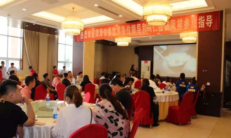 (菏泽旅游饭店协会考察团一行观看风祥食品生产影像片)