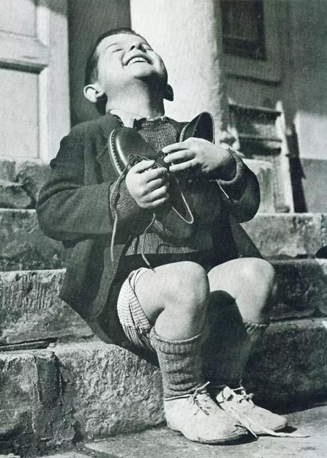二战中,第一次收到新鞋的小男孩,抱着鞋子开心极了。他脚上的那双真的不能再穿了。