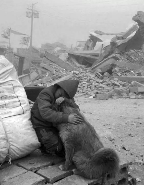 没有了家的小男孩,抱着一直默默待在旁边的狗狗,哭了很久很久。