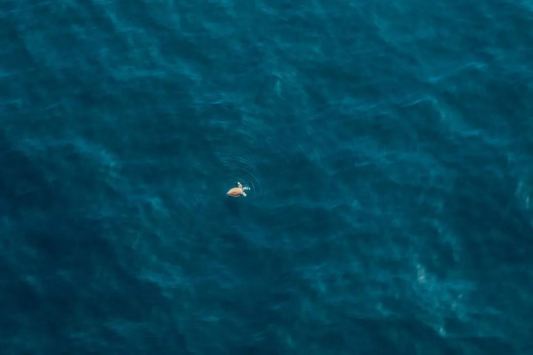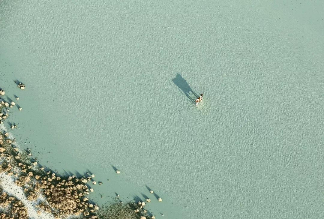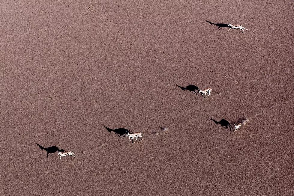 如火烈鸟、好望角大羚羊、甚至是一只在蔚蓝的海水中休息的乌龟。动物们行进时留下的痕迹和阴影都是他作品中重要的组成元素。