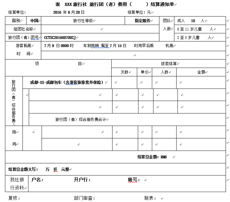 单项委托合同签订好之后,组团社就应该给团队或个人发一个费用结算通知单,敦促对方把钱划在账户上。