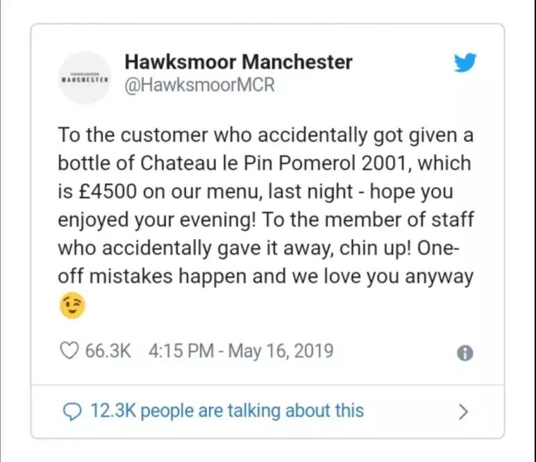 “昨晚意外喝了我们名庄酒的顾客,希望那瓶4500英镑的2001年里鹏酒庄葡萄酒让您度过了一个愉快的夜晚!不小心拿错酒的那位服务员,振作起来!人生难免犯次错,我们依然爱你哟。”