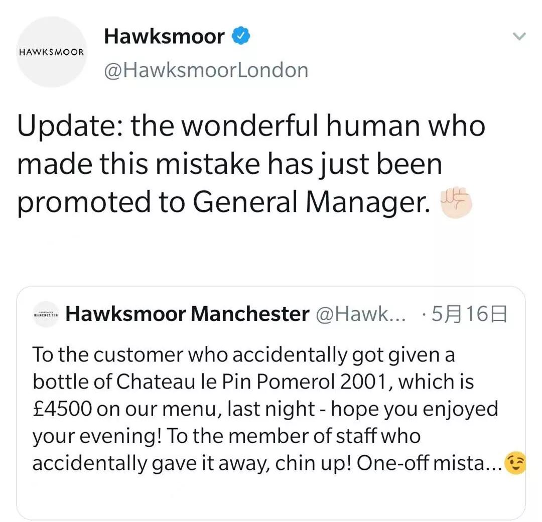 更劲爆的是,时隔近四个月,霍克斯莫尔曼彻斯特分店昨天又在推特上公布:“最新爆料:犯下这个错误的奇人刚刚被提拔为总经理。”