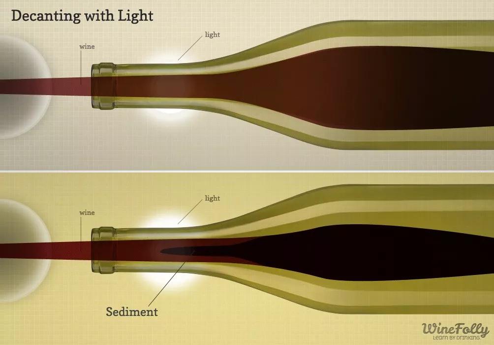 传统做法都是在强光源下倒酒,看到最后沉在瓶底的酒渣后,立马停下