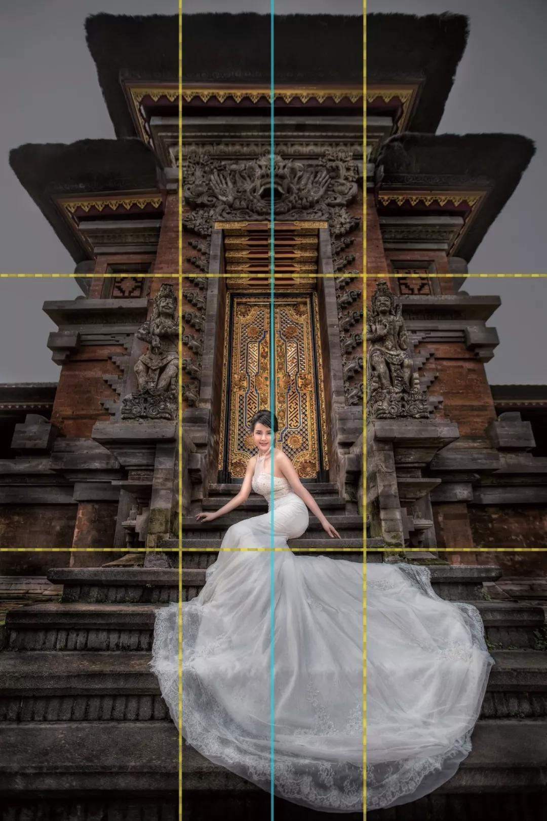 但其实这也是借用了建筑物的线条引导,将观者注意力从前景延伸到背景,又或者从背景过渡到画面主体(蓝色线为对称参考线)。