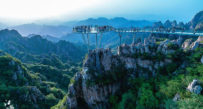 平台上的红五星非常醒目,与狼牙山红色主题相吻合。平面面积466平米,可容纳200余人。可体验“身处云海之中,上可轻抚蓝天,下可俯瞰大地”的神奇,下午4:00乘车返回