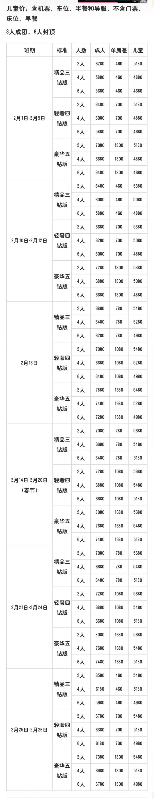成人 ¥7480 /人, 儿童 ¥5680 /人