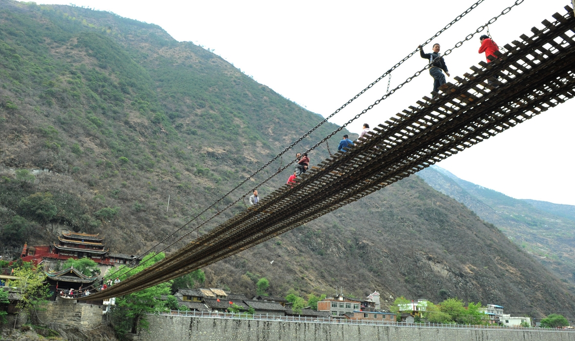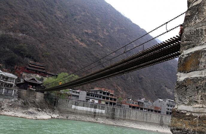 发展历史:泸定桥两岸的桥头古堡为传统木结构古建筑,泸定桥俯瞰为中国独有。该桥始建于清康熙44年(1705年),建成于康熙45年(1706年)。康熙御笔题写"泸定桥",并立御碑于桥头,两岸桥头堡为木结构古建筑,风貌独特系国内独有。中国工农红军在长征途中“飞夺泸定桥”,使之成为中国共产党重要的历史纪念地。