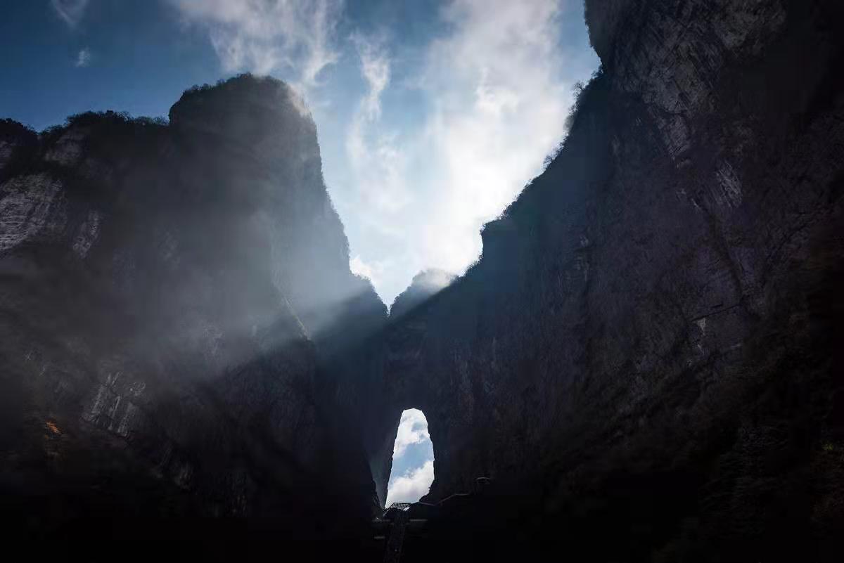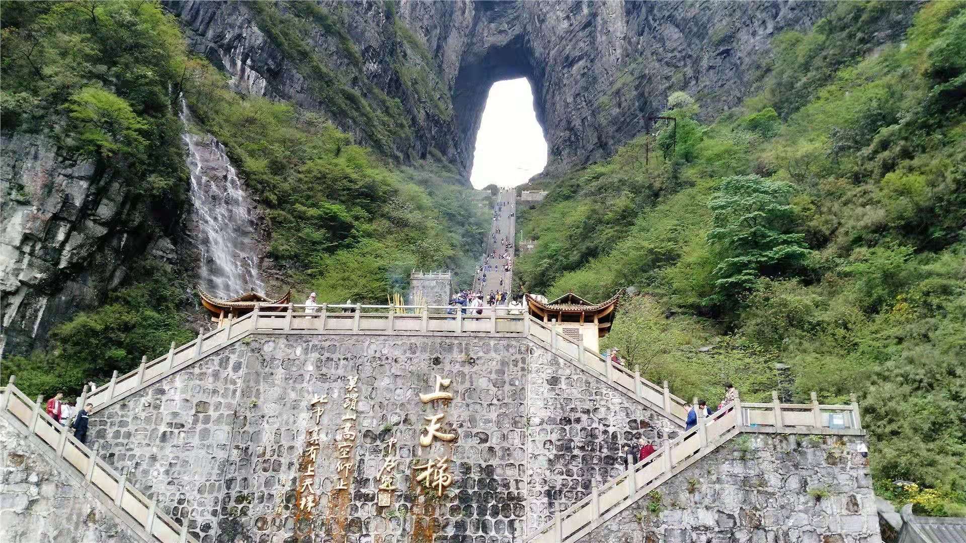 在古老的中国大地上,有一个人间通往仙界桃源的大山,武陵山脉之魂——天门山。您只要从天门山脚登上九百九十九级石阶梯,就会到达通往仙界的大门——天门洞。版权所有山东聊城聊之旅国际旅行社有限公司,转载必究!硕大的门洞足够现代人驾驶飞机穿越而过,是世界上最高的天然溶洞,该天门洞形成的时间比唐僧取经时收取的由石头爆出的大徒弟孙悟空还早500余年(公元263年溶洞形成)。它是天门山中一块大石块由于吸聚天地之灵气喷溥洞开而成。从此,凡人间伟大人物仙逝,该天门山上不管是晴空万里还是满天星斗,都瞬间电闪雷鸣,风雨交加,犹如天门洞落泪,倾盆而下……泪水沿着绝壁山崖瀑布而泻,远远望去,似天上银河下九洲。这现象至今仍无法开解!