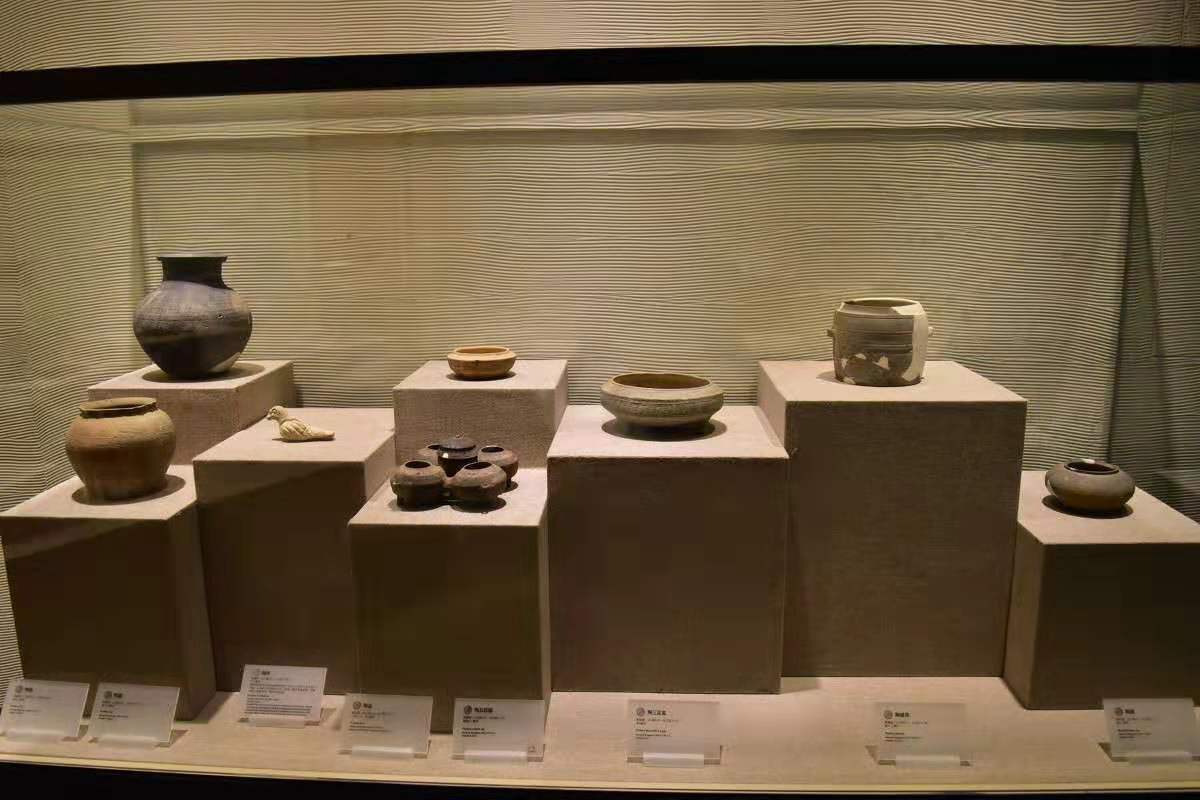 展览宫内展示的陶器:刚出土不久的陶器,再考古人员小心地、一遍一遍地擦拭下、散发出了一点点的光泽。这些陶器,由里至外都透出年代的久远,透出古人的智慧。