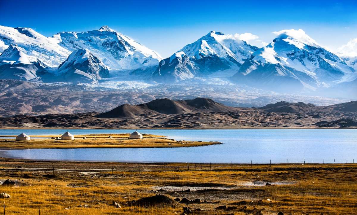 卡拉库里湖地处帕米尔高原东部的幕士塔格冰山脚下,该湖在群山环抱之中,湖畔水草丰美,常有柯尔克孜牧民在此驻牧。遇到晴朗的天气,碧水倒映银峰,湖光山色浑为一体,景色如诗如画,使人沉醉迷恋,依湖建有旅游接待站,备有帐篷蒙古包、游艇、骆驼、马等供游人之需。