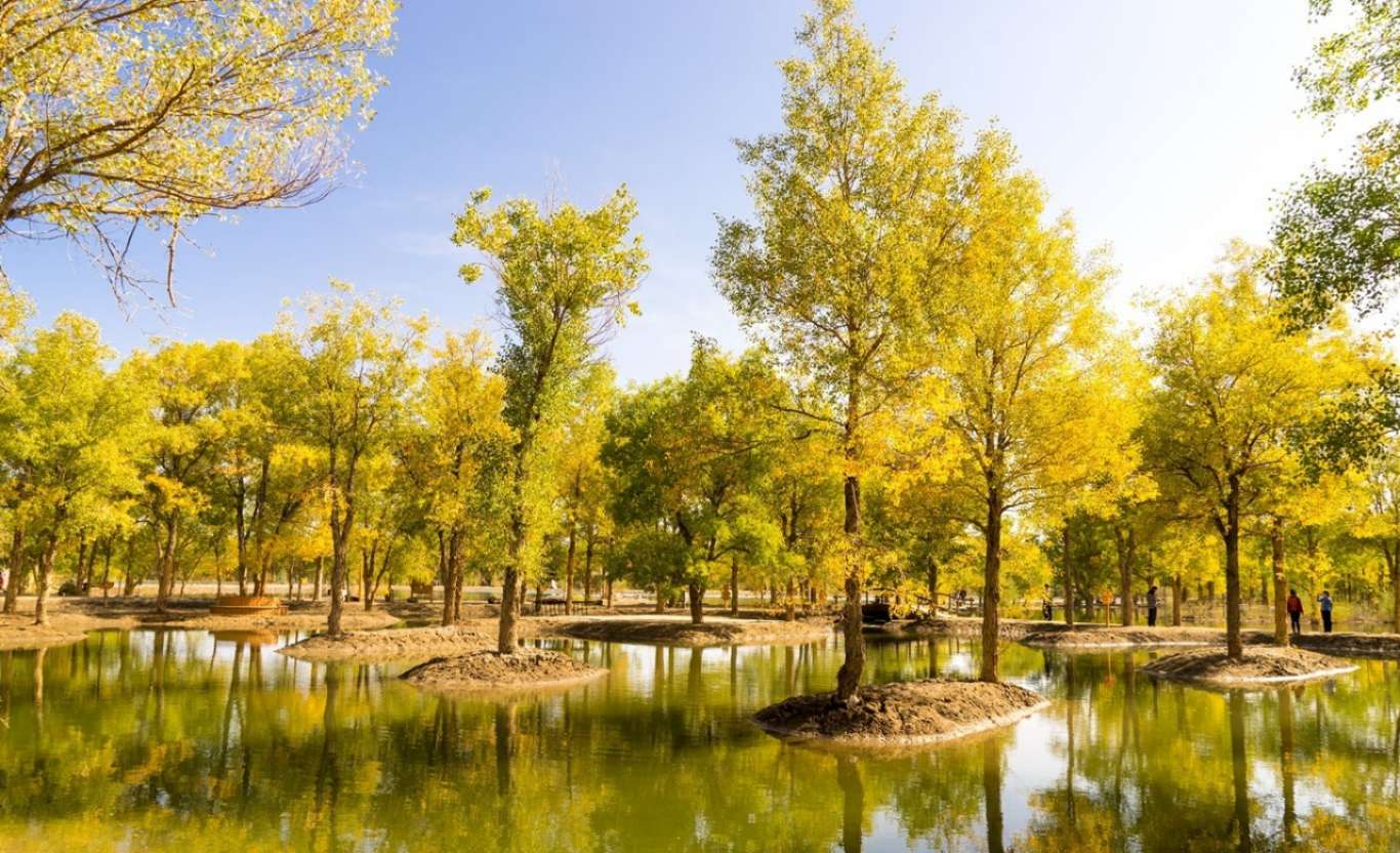 金塔沙漠胡杨林景区,位于古丝绸之路中段北侧、甘肃省金塔县城西北8公里处,由胡杨林-金波湖核心游览区、沙枣林观光休闲区、瀚海红柳林保育区、沙漠康体理疗区和芦苇湿地迷宫区五个功能区组成,占地面积达8万余亩,景区内分布着西北地区最大的“化石级植物”万亩人工胡杨林,极具观赏价值。