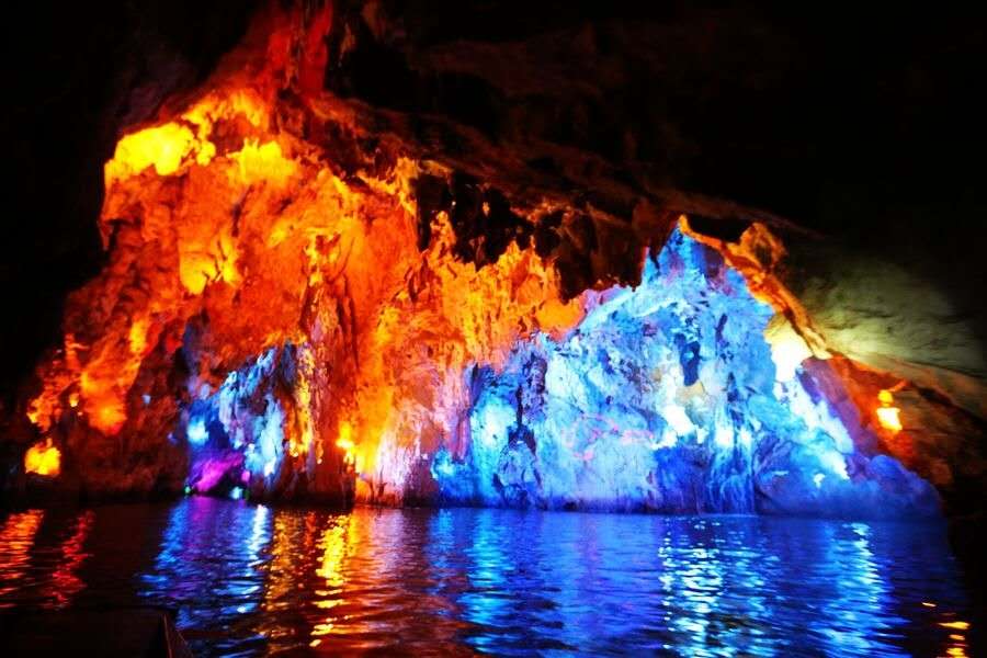 一、二进龙宫被誉为全国最长、最美的水溶洞,为龙宫三绝之一,其蜿蜒于龙宫奇峰异谷之下,堪称一绝。其中一进龙宫长840米,由群龙迎宾厅、浮雕壁画厅、五龙护宝厅、水晶宫、高峡幽谷宫五个部分组成,乘船穿行于溶洞暗河之中,头顶斑斓的洞中奇景若绚丽的夜空,与平静水面的倒影交相辉映。二进龙宫全长400米,共分为四个大厅。洞内景观粗旷,钟乳怪诞,如刀劈似斧削,潭深水幽,曲折神密,水幕电影光怪陆离,船行其中恍如“时光隧道”,妙趣横生。