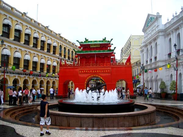 在50至70年代中旬,澳门的亲北京团体在每年十月于议事亭前地(或附近一带如星光书店旧址、邮政局旁)竖立由跨前地之木制红色牌楼,与市政厅大楼相对,庆祝过后便拆卸,印证著澳门当时政治对立的局面。牌楼通常高三层,与附近建筑物高度几乎相同,彷照天安门样式布置,上面有澳门同胞庆祝国庆字样,落地注中有当时之政治标语,上有大型绘画,每年主题不一,晚上亮灯或燃放鞭炮以示庆祝。