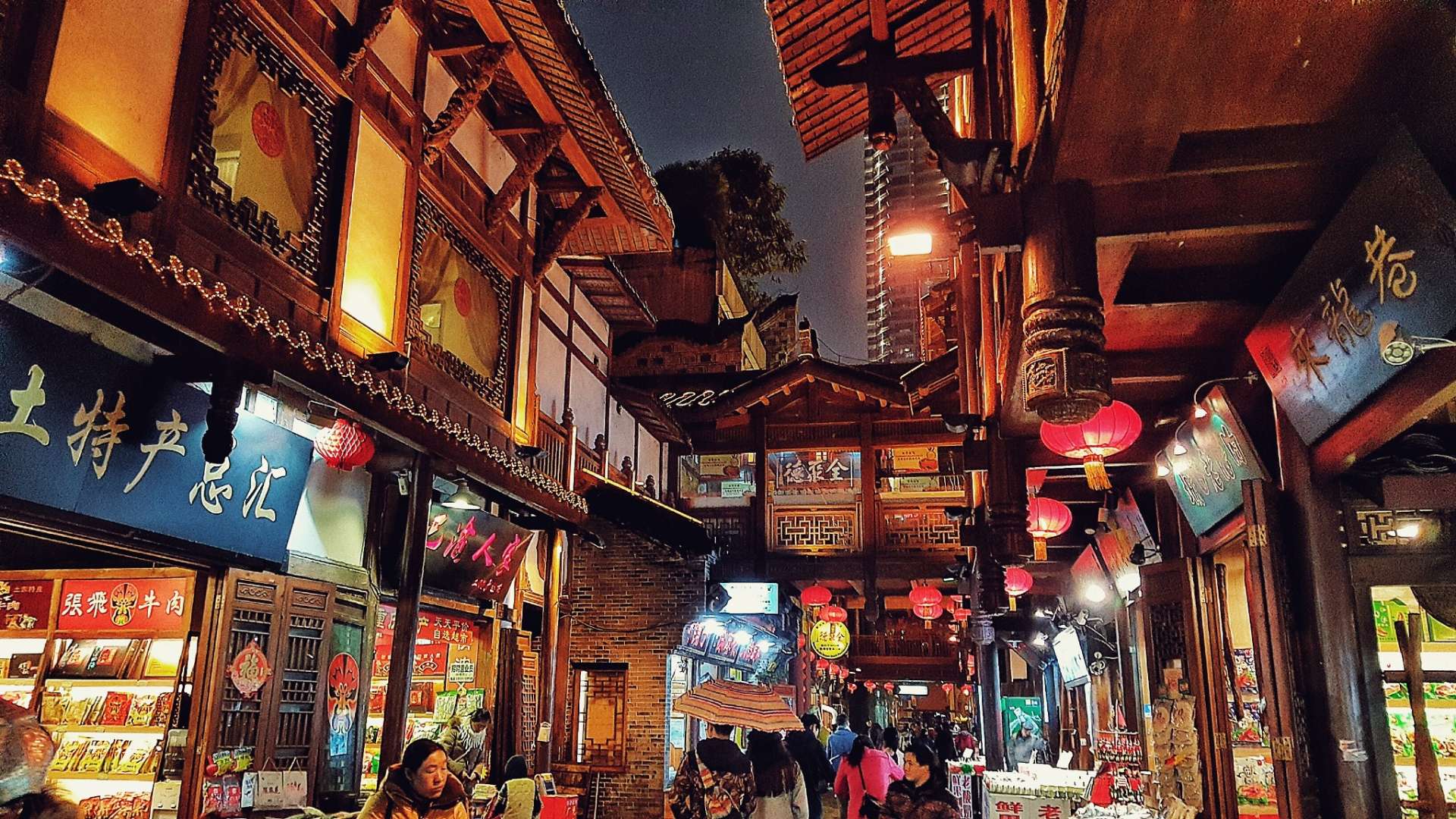 展现的是“另类美食城”的景色,位于第4层,集中了中外名店。临江一面有工匠当街打糍粑、切桃片、烤制花生糖,以及现场演绎美食特产制作工艺,临崖一面有小吃店,旦旦面、猪儿粑、大汤圆、歌乐山辣子鸡、黔江鸡杂,老重庆毛血旺等。