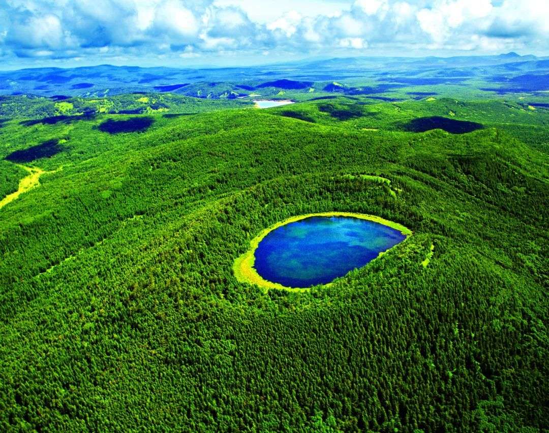阿尔山天池,位于阿尔山市东北74公里的天池岭上,由火山喷出物落在喷火口周围形成一道环状围墙,中间形成圆形凹坑,多年积水而成。