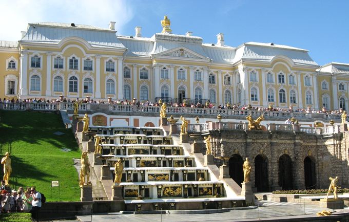 18世纪中,为纪念俄国在北方战争中的胜利,在宫殿的前面建造了一个由64个喷泉和250多尊金铜像组成的梯级大瀑布。