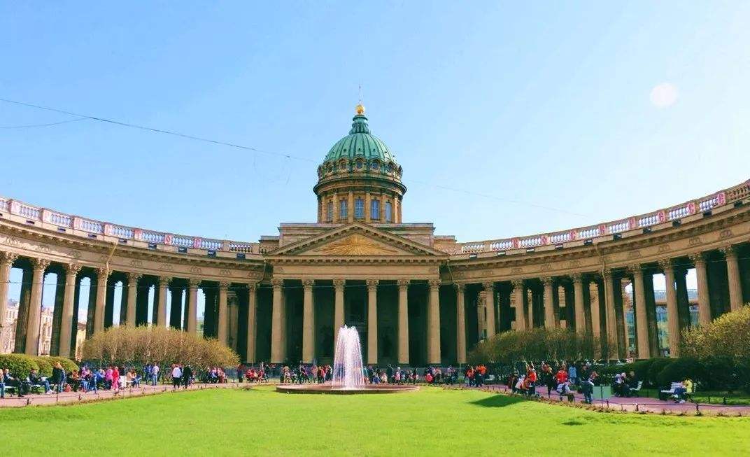 喀山大教堂位于圣彼得堡的涅瓦大街上,由俄罗斯建筑师沃罗尼欣设计,于1801年8月开始奠基仪式。教堂以古罗马圣彼得教堂为原本,历经10年于1811年竣工。但是由于教堂的正门面向东方,侧面面临涅瓦大街很不美观。所以,在教堂北面竖立94根科尼斯式半圆型长柱长廊使喀山教堂变成典型的俄式教堂。