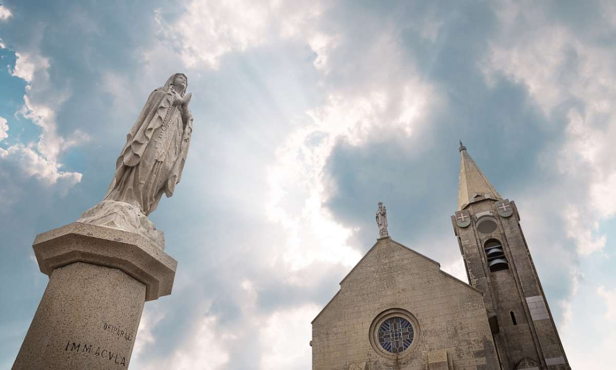 教堂前是一片宽广平台,平台尽处竖立一尊大理石雕刻而成的圣母像,圣母双手合十,貌甚慈祥,面临大海。平台下有一路德圣母岩洞,循左右环抱之石阶而下,即达洞前。版权所有山东聊城聊之旅国际旅行社有限公司,转载必究!洞内岩石嶙峋,中开拱门,内立圣母像,象征古时圣母在法国路德城内,当众显灵的情景。其间正置祭坛,洞前有铁栅围绕,地上设有多排低矮的长石板,供教徒跪拜,忏悔。