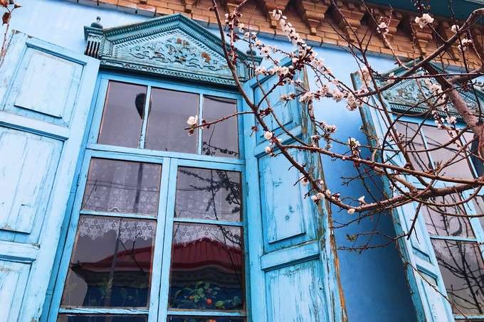 这里的民居与环境始终保持着较为完整的传统风貌与格局,颇具中西亚特色及“塔兰奇”传统文化风格。喀赞其的房屋建筑对蓝色的使用频率非常高,或者在外墙,或者在屋顶,更多时候是在门板和窗棂,蓝色大都是主色调,整个建筑显得精致而纯净。