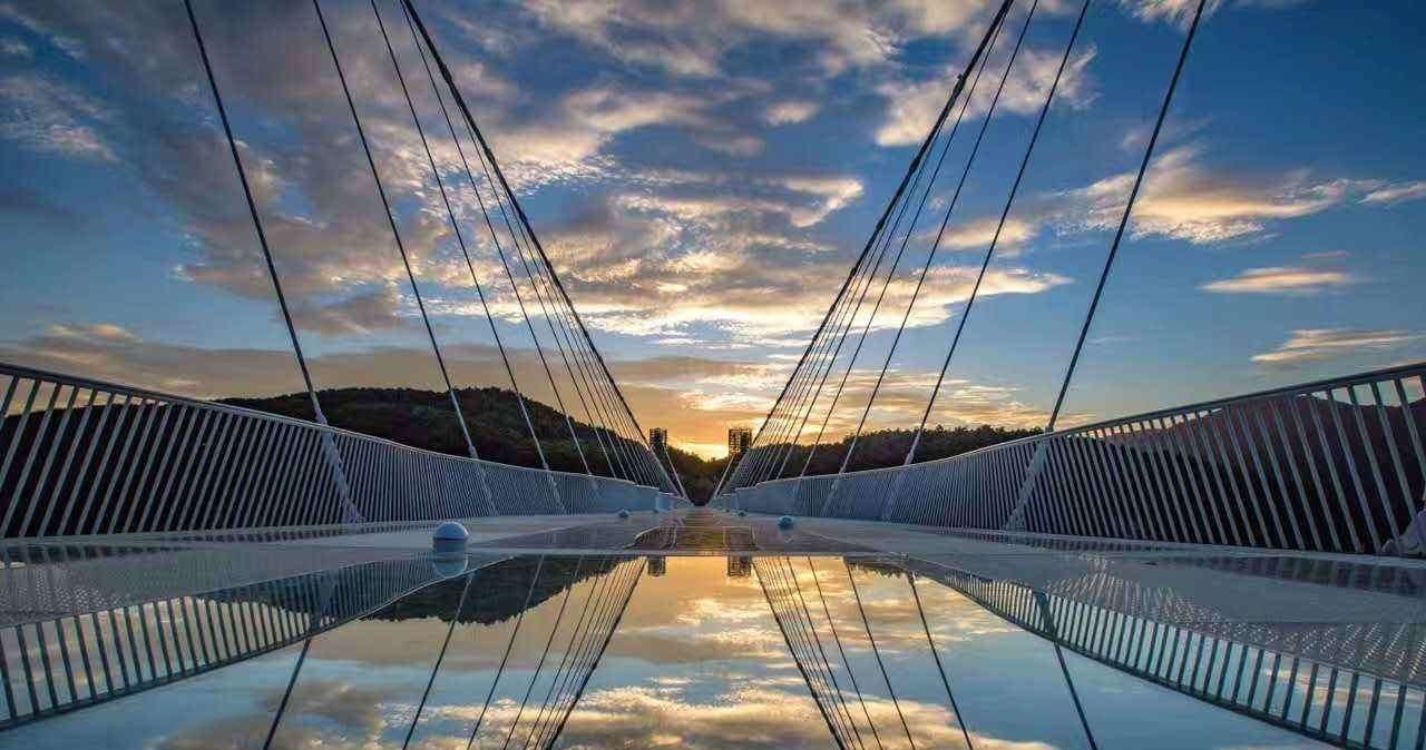 云天渡采用玻璃作为桥面板,在加劲梁主(边)纵梁和横梁所围成的露空区域,设置三层钢化玻璃,层间设置胶片;在主(边)纵梁和横梁上方铺设两层钢化防滑玻璃,层间也设有胶片。玻璃结构下方和侧面均设置经优化的弹性橡胶垫片,以保证玻璃结构在各种荷载作用下具有足够的间隙和变形协调能力,从而使其只承受局部荷载,不参与全桥结构的整体受力。每块钢化夹胶玻璃的四边中点处均设有防止上抛扣件,增强结构安全,胶片垫片外侧途覆硅酮耐候结构密封胶以提高其耐久性。