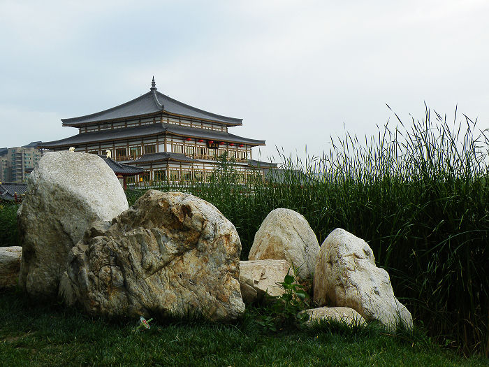 沿着唐城墙遗址走到东南角,就是曲江池遗址公园的西入口。举目远眺,能看到湖心仙岛,波光中依仙岛而设的荷廊恰似一朵盛开的水莲花。若是向更远处,能望到阅江酒楼在曲江池南岸的柳色掩映中,酒旗招展似乎要引得游人快步,而重重柳堤、香花和池水却致人流连漫步。性急的游客,这时候也可以直接驾车取曲江池西路直接绕到公园南口进酒楼,然而这未免饕餮了一路由北向南的盛景。