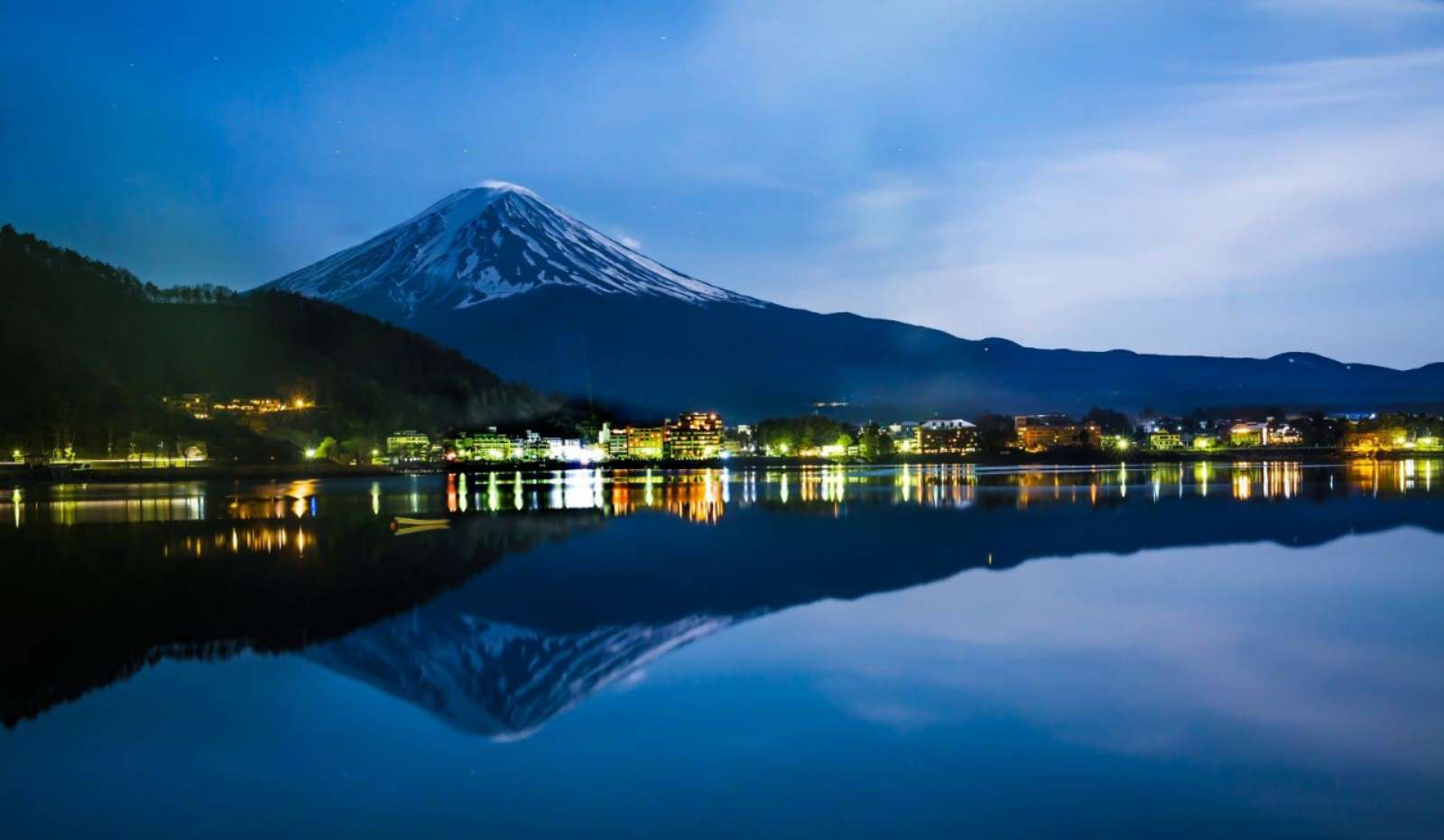火山湖,海拔724米,方圆20千米,面积7平方千米,湖最深处达45米,湖水清澈湛蓝,晴天时可从这里看到终年积雪的富士山,淡青色的湖水中倒映出